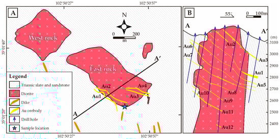 (A) Sketch geologic map of the Zaorendao gold deposit and (B) selected exploration cross section showing the occurrence of gold ores (after [51]).