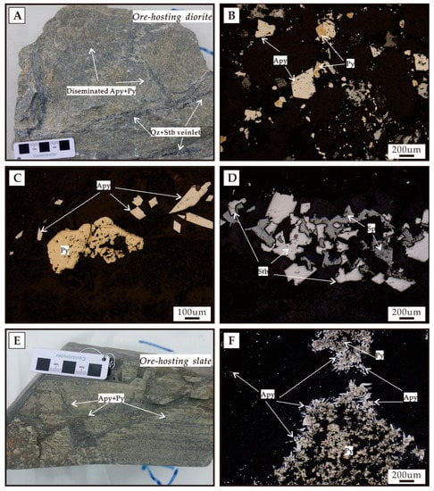 Photographs (A,E) and photomicrographs under reflected light (B–D,F) showing mineralization styles and mineral assemblages. Disseminations of pyrite and arsenopyrite in diorite (A–C). Stibnite veinlet in diorite (A,D). Disseminations of pyrite and arsenopyrite in slate (E,F). Mineral abbreviations: Apy = arsenopyrite, Py = pyrite, Qz = quartz, Sp = sphalerite, Stb = stibnite.