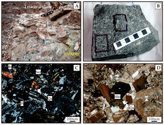 Photographs and photomicrographs of the diorite in the Zaorendao deposit showing its geologic relationship with Triassic slate (A) and texture and mineral association (B–D). Blue box lines in Figure (B) show locations of doubly polished thin sections. Mineral abbreviations: Bt = biotite, Hbl = hornblende, Pl = plagioclase, Qz = quartz, Ser = sericite.