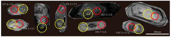 Zircons separated from sample 17ZRD01 are mostly colorless to pale yellow, transparent, and commonly euhedral prismatic to elongated prismatic. The length of zircons varies from 90 to 250 μm with aspect ratios of 5:1 to 2:1. Most zircon grains show oscillatory zoning in CL images (Figure 5), consistent to that of igneous zircons [62]. Some grains display a core-rim structure consisting of an inherited core with distinct oscillatory and patchy zoning (Figure 5).