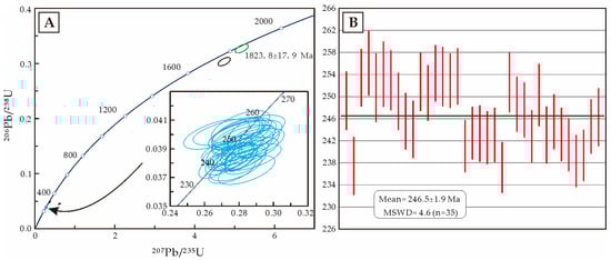 Thirty-nine analyses were carried out for U–Pb dating on sample 17ZRD01, yielding U-Pb ages ranging from 237.2 ± 2.3 Ma to 1823.8 ± 17.9 Ma. Thirty-seven analyses were obtained from the zircons with oscillatory zoning, among which, two analyses (spot 17ZRD01.10, 17ZRD01.17) give 206Pb/238U dates of 285.0 ± 3.0 Ma and 306.4 ± 3.2 Ma, and are excluded because they are statistical outliers. The remaining 35 analyses are concordant, with 206Pb/238U dates ranging from 237.2 ± 2.3 Ma to 256.1 ± 2.9 Ma with a weighted mean of 246.5 ± 1.9 (MSWD = 4.6, Figure 6). The Th/U ratios of the zircons are between 0.15 and 0.55, with an average of 0.34. The high Th/U values for the zircons suggest that they are magmatic in origin. The Th content ranges from 25.17 to 324.02 ppm, with an average of 104.43 ppm. The U content ranges from 97.60 to 1404.46 ppm, with an average of 344.91 ppm. The U-Pb age is therefore interpreted as the crystallization age of the diorite. One analysis (17ZRD01.27) on the zircon core yield 206Pb/238U age of 1707.3 ± 17.4 Ma is excluded because it is a statistical outlier. The remaining one analysis (spot 17ZRD01.36), gives a 206Pb/238U dates of 1823.8 ± 17.9 Ma with Th/U ratio of 0.17 (Table 2, Figure 5 and Figure 6A). This is concordant and interpreted to be inherited during its emplacement.