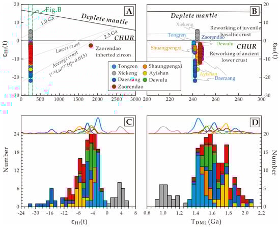 Plots of εHf(t) values vs. U-Pb ages for zircons from the diorite in the Zaorendao deposit (A, B). (C) Histogram, and frequency curves of εHf(t) values. (D) Histogram, and frequency curves of corresponding two-stage model age (TDM2). Date from the igneous rocks of Tongren-Xiahe-Hezuo district are shown (Date are from Reference [12] and references therein.