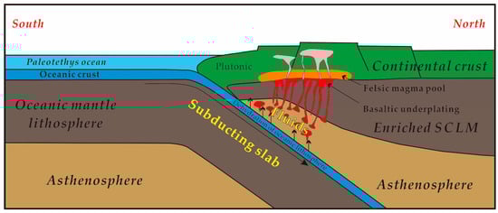 Schematic cartoon illustrating the petrogenesis of the ore-hosting diorite at Zaorendao and regional Triassic magmatism in the Tongren-Xiahe-Hezuo polymetallic district (modified after [12]). SCLM = sub-continental lithospheric mantle.