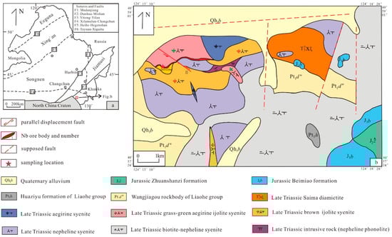 The Saima deposit is located in the intersection of the Taizihe–Hunjiang fault depression and Yingkou–Kuandian uplift in the Liaodong Massif, northeast of the North China Craton. Stratigraphic units are dominated by the Neoproterozoic, Cambrian–Ordovician, Jurassic and Quaternary alluvium. Massive Late Archean to Mesozoic granitic intrusions are exposed in the region, with particularly intensive magmatism during Late Triassic and Jurassic. Alkaline rocks closely related to the rare earth deposits are distributed along the intersection between the E–W-trending fault and NNE–SSW-trending fault. This alkaline rock belt extends about 40 km from east to west, with the width of 15 km, covering an area of about 200 km2. These rocks occurred as small stocks and apophysis and intruded into the Pre-Ordovician formations, showing angular unconformity contact with the overlying Jurassic strata. Four alkaline intrusions and abundant alkaline volcanic-subvolcanic rocks constitute the alkaline rock belt, with their alkalis gradually increasing from east to west and rock types changing from syenite–miascite (biotite–nepheline) to aegirine nepheline syenite. Regional faults are dominated by the E–W-trending faults, accompanied by the NE–SW-trending, NW–SE-trending and NNE–SSW-trending faults. The Saima deposit is located in the intersection of EW-trending fault and NE–SW-trending fault (Figure 1a), as these faults acted as the conduits for the migration and enrichment of ore-forming elements and provided favorable conditions for the formation of an alkaline rock type niobium deposit.