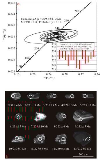 Most of the zircons from the aegirine nepheline syenite (SMN1) are transparent, euhedral and colorless, with length/width ratios of more than 2:1. Typical oscillatory zoning of magmatic crystallization is common in most of the zircon grains under CL (Figure 4). In addition to their relatively high Th/U ratios (0.5–1.0), a magmatic origin is indicated [9,10]. Thirteen zircon U-Pb analyses are summarized in Table 1 and have yielded concordant 206Pb/238U ages of 233 to 222 Ma, with a weighted mean 206Pb/238U age of 229.5 ± 2.2 Ma (MSWD = 0.54; Figure 4).