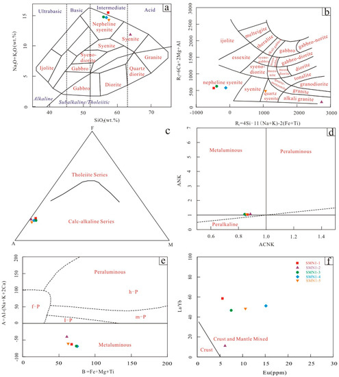 Geochemical classification diagrams for the syenites in the Saima deposit. (a) TAS diagram. (b) R2 vs. R1 diagram. (c) FAM diagram. (d) A/NK vs. A/CNK diagram. (e) [Al − (Na + K + 2Ca)] vs. (Fe + Mg + Ti) diagram. (f) La/Yb vs. Eu diagram (after Le Maître 1989; after Middlemost, 1994; after Irvine, 1971) [11,12,13].