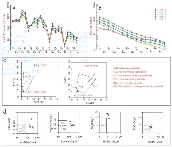 Geochemical classification diagrams for the syenites in the Saima deposit. (a) Primitive mantle-normalized trace-element diagram (normalized data from Sun and Mcdonough,1989); (b) Chondrite-normalized rare-earth element (REE) patterns (normalized data from Boynton, 1984); (c,d) Structural discriminant diagram (after Defant and Drummond, 1990; modified from Pearce 1982) [25,26,27,28].