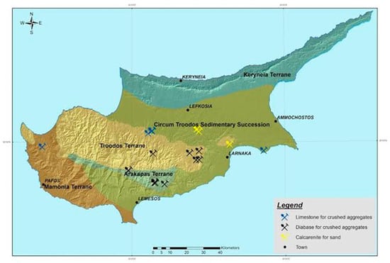A total of 30 crushed fine (0–4 mm) aggregate samples from several active quarries located in the various geological zones of Cyprus were collected for this study (Figure 1). The samples originated mostly from the Troodos Ophiolite Complex and the Circum Troodos Sedimentary Succession (specifically Pakhna and Nicosia Formations). These aggregates are normally used locally in Portland cement mortar/concrete and asphalt concrete production. Table 1 provides a list of all the test samples by material type.