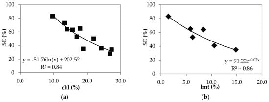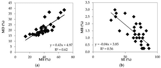 Figure 5. (a) Correlation between Micro-Deval (MD) and magnesium sulphate soundness coefficient (MS); (b) correlation between sand equivalent (SE) and methylene blue (MB).
