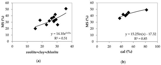 Figure 4. (a) Correlation between phyllosilicate and zeolite minerals and magnesium sulphate soundness coefficient (MS) for diabasic/basaltic aggregates; (b) correlation between calcite (cal) and magnesium sulphate soundness coefficient (MS) for calcarenite limestone aggregates.