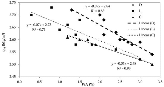Figure 6. Correlation between water absorption (WA) and oven-dried particle density (ρrd) (D: Diabase/Basalt, L: Reef Limestone, C: Calcarenite Limestone).
