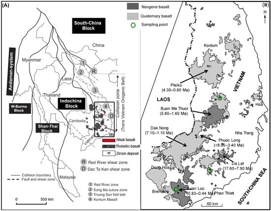 (A) Location of various alluvial zircon deposits in Cambodia and Vietnam within South-East Asia [12,24]. (B) Distribution of Neogene and Quaternary basalts with their K-Ar and Ar-Ar ages (after [4,6]). Reproduced with permission from all authors. Green circles indicate the sampling localities.
