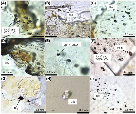 Representative inclusions found in placer zircon megacrysts: (A) fluid inclusions (LH2O: aqueous H2O VCO2 and VO2: vapor CO2 and O2, respectively); (B) Calcite (Cal); (C) hematite (Hem); (D) baddeleyite (Bdy) within tubular channels; (E) quartz (Qz) within tubular channels; (F) hematite and fluid (Hem + Fld) within bifurcating cavities and vesicles; (G) baddeleyite (Bdy) in tubular channels, bifurcating cavities, and vesicles; (H) corundum (Crn); and (I) calcite (cal) inclusion groups and along chains.
