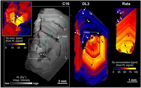 Laser-induced photoluminescence hyperspectral images of zircon samples from the Central Highlands (C16 and DL3) and from Ratanakiri, Cambodia (Rata). The integrated intensity of the Dy3+ (4F9/2 → 6H13/2) emission (compare Figure 6) is the plotted spectral parameter (grey-scale). Trace-element concentrations of Dy from multiple LA-ICP-MS spots on the grains, were used for external calibration to correlate the Dy concentrations with its PL response. Concentrations given color-coded were back-calculated using the latter correlation (see Figure 6) to extrapolate the Dy distribution in regions of unknown trace-element chemistry. Besides oscillatory and sector zoning, several growth zones may be distinguished that were interpreted to result from resorption and re-growth events, as indicated by the cross-cut zonation patterns, abruptly changing (decreasing) Dy concentrations, and the appearance of large holes and cavities (see arrows).