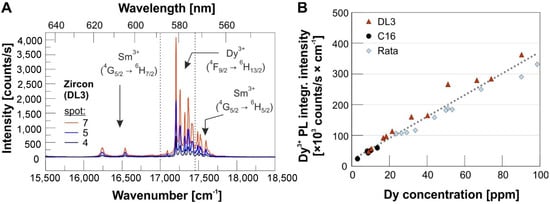 (A) Laser-induced PL spectra (laser-excitation wavelength λexc = 473 nm) obtained from three different measurement spots on the zircon sample DL3 (spots 4, 5, and 7; Figure 5). (B) The integrated intensity of the most intensive emission of Dy3+ in the spectral range 17,000–17,450 cm−1 (see dotted lines in sub-image (A)) from multiple spots on samples DL3, C16, and Rata plotted against the Dy trace-element concentration as obtained from LA-ICP-MS (Table S1). Linear regression from the data pairs PL vs. Dy conc. (R2 = 0.95) was used to calibrate hyperspectral maps presented in Figure 5.