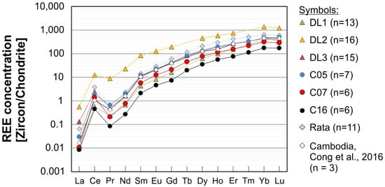 Chondrite-normalized plot of REE concentrations of zircon samples from the Central Highlands compared to samples from Ratanakiri, Cambodia. REE composition of C1 chondrite is described by Sun and McDonough [42]. All samples showed a steep slope rise from La to Lu, towards heavy REEs. A positive pronounced Ce-anomaly, but no Eu-anomaly was detected.