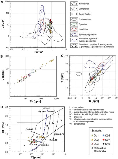 Compositional discrimination diagrams using trace-element concentrations of the studied samples obtained by LA-ICP-MS [16]: Ce/Ce* vs. Eu/Eu* (A); U vs. Th (B); Y vs. U (C); and Hf vs. Y (D) [41].