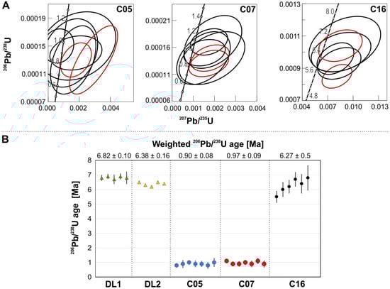 Summary of U-Pb geochronology data obtained by LA-ICP-MS (see details in Tables S2 and S3). (A) Representative concordia plots of samples C05, C07, and C16. Ellipses give a 2σ error, and red ellipses correspond to measurement spots placed in the core region of single crystals. (B) 206Pb/238U ages of the samples analyzed with the mean weighted age given for each sample. Error bars represent 2σ. Note that the ages obtained do not differ systematically amongst the measurement spots placed in the different growth zones within the individual samples. Two distinct sample populations were clearly differentiated (ca. 6.5 Ma and ca. 1 Ma).