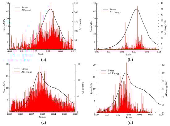 The uniaxial compressive stress–strain curves with AE counts are shown in Figure 4a, and the stress–strain curves with AE energy are shown in Figure 4b for mortar samples with a cement–sand ratio of 1:2. The evolution laws of the AE count and AE energy of mortar samples during compression are consistent for not only the three example groups illustrated in Figure 4 but for all nine groups.