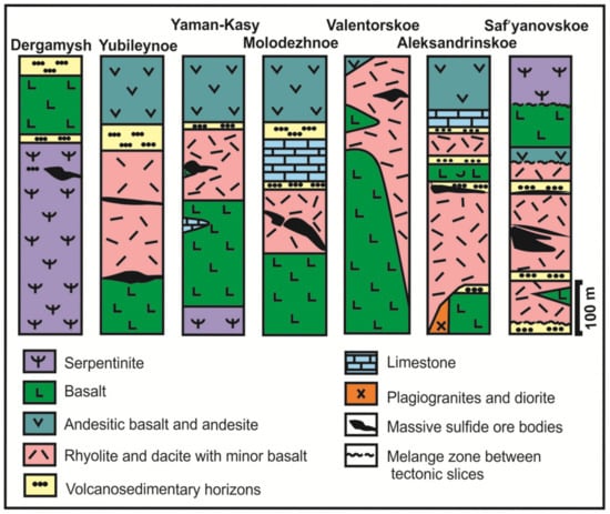 Schematic geological cross-sections of the Urals VHMS deposits studied (modified after [19,45,51]).