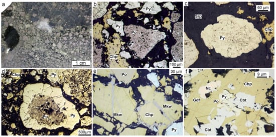 Pyrrhotite-rich diagenite after an altered sulfide sandstone mixed with serpentinite clasts of the Dergamysh deposit: (a) General view; (b) pseudomorphic pyrrhotite and chalcopyrite after ore clasts; (c) pyrite nodule in serpentine; (d) pyrrhotite–pyrite nodule; (e) mackinawite veinlets in anhedral chalcopyrite; (f) nickeline grain rimmed by gersdorffite in anhedral chalcopyrite nearby cobaltite and pyrite crystals. (a) Polished sample, (b–f) reflected light.