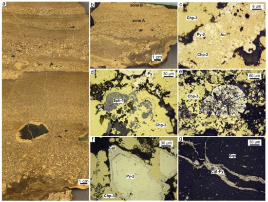 Mineralogical features of chalcopyrite-rich diagenites of the Dergamysh deposit: (a) Chalcopyrite nodules with serpentinite cores in sulfide turbidite; (b) chalcopyrite-rich diagenites enriched in fine-grained chalcopyrite in the upper part of the rhythms (zone B) and relict pyrite and serpentinite (black) clasts in the lower part (zone A); (c) authigenic native gold in chalcopyrite-2 replacing pyrite fragments; (d) replacement of sphalerite clasts by chalcopyrite-2; (e) radial columnar marcasite nodule in chalcopyrite-2; (f) replacement of euhedral zonal pyrite crystal by chalcopyrite-2 and carrollite (g) veinlets of a phase of intermediate composition between cattierite and pyrite (Cat-Py) with inclusions of cobaltite in the serpentine core of the chalcopyrite nodule; (a,b) Polished sample, (c–g) reflected light.