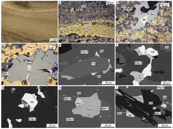Mineralogical features of chalcopyrite-rich diagenites of the Molodezhnoe deposit: (a) Chalcopyrite-rich diagenites in sulfide turbidites; (b) intercalation of chalcopyrite- and sphalerite-rich diagenites; (c) altaite inclusion in galena veinlet; (d,e) intergrowth of hessite, galena and tennantite in chalcopyrite-3 and sphalerite-3; (f) clausthalite and kurilite in authigenic chalcopyrite-3; (g) clausthalite and roquesite in chalcopyrite-3; (h) assemblage of hessite, coloradoite, petzite, and sphalerite-3 in chalcopyrite-3; (i) replacement of chalcopyrite-3, hessite and altaite by chlorite. (a) Polished sample; (b–d) reflected light; (e–i) BSE photo.