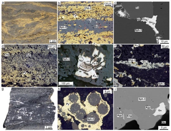 Mineralogical features of sphalerite-rich diagenite of the Valentorskoe (a–c), Aleksandrinskoe (d–f), and Saf’yanovskoe (g–i) deposits: (a) Intercalation of sphalerite-rich and chalcopyrite-rich diagenites with slamping texture; (b) a more detailed view of the previous photo; (c) tennantite and galena in assemblage with altaite and anglesite in sphalerite-3; (d) sphalerite in the upper part of the pyrite–chalcopyrite turbidite; (e) relict pyrite-2 clast overgrown by pyrite-3 in sphalerite-3; (f) lenses of galena-3, sphalerite-3, and chalcopyrite-3 in chert; (g) sphalerite-rich diagenites with barite (white) crowned by gray cherts; (h) selective replacement of colloform pyrite by sphalerite-2; (i) argyrodite in assemblage with galena and enargite in sphalerite-3. (a,g) Polished sample, (b,d–f,h) reflected light, (c,i) SEM photo.