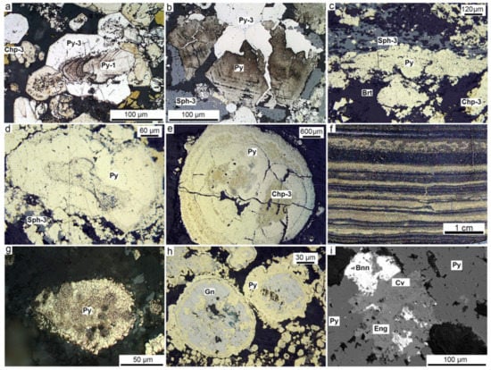 Mineralogical features of pyrite-rich diagenite of the Yaman-Kasy (a,b), Molodezhnoe (c,d), Aleksandrinskoe (e) and Saf’yanovskoe (f–i) deposits: (a) Relict pyrite-1 in euhedral crystal of pyrite-3; (b) pseudomorphic sooty pyrite (Py) replaced by anhedral pyrite-3; (c) layer of pyrite-rich diagenite in assemblage with barite and sphalerite; (d) zoned pyrite nodule; (e) pyrite nodule partly replaced by chalcopyrite; (f) intercalation of pyrite-rich diagenites and carbonaceous shales; (g) framboidal and crystalline pyrite nodule; (h) replacement of pyrite nodules by galena and tennantite; (i) enargite, bournonite and covellite in authigenic pyrite. (f) Polished sample, (a–e,g,h) reflected light, (i) SEM photo.