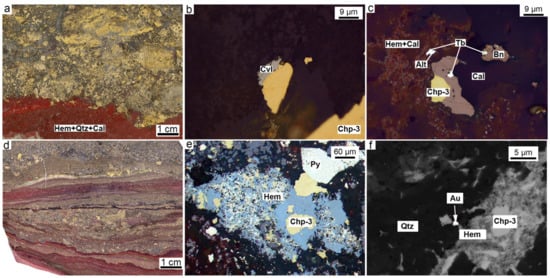 Mineralogical features of chalcopyrite-rich diagenites of the Yaman-Kasy deposit: (a) General view; (b) immature replacement of pyrite and sphalerite clasts by chalcopyrite-2; (c) mature replacement of pyrite clast and vestimentifera tube by chalcopyrite-2 and -3; (d) replacement of pyrite clast by chalcopyrite followed by hematite and chlorite; (e) inclusion of altaite in chalcopyrite-2,3 with relict sphalerite replaced by chlorite; (f) native antimony inclusion in chalcopyrite-2,3. (a) Polished sample, (b–d) reflected light, (e,f) back-scattered electron (BSE) images.