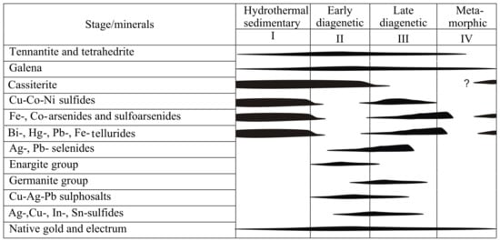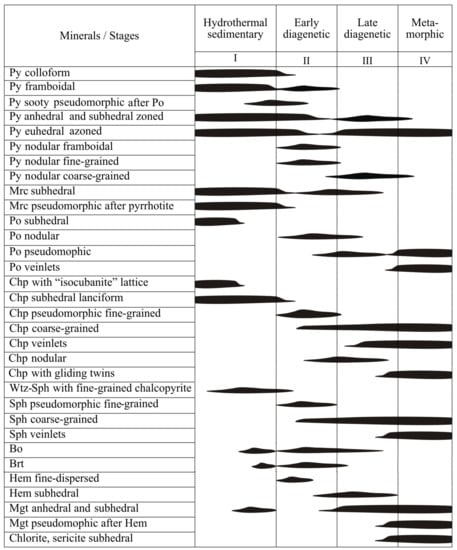 Even though deposits are part of the Uralian orogen, the host rocks of the deposits are mostly undeformed and have undergone low metamorphism restricted to zeolite or prehnite–pumpellyite facies [60,61]. Primary colloform and framboidal textures, sooty pyrite, sulfidized vent fauna and primary delicate microtextures of chimneys with a well-preserved lattice isocubanite structure and preserved chalcopyrite emulsion (“chalcopyrite decease”) in sphalerite and pseudomorphs of sphalerite after würtzite indicate a very low degree of metamorphic overprint [19,45,48,49,55,62,63,64,65], accounting for the exceptional degree of preservation of some deposits [36]. In some deposits, ferruginous sediments also record well-preserved primary features consistent with diagenetic and low metamorphic mineral evolution only, showing relict features of neotokite and nambulite [66]. Our interpretation is that the mineral assemblages were formed during primary hydrothermal and diagenetic stages including seafloor supergene alteration.
