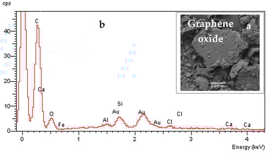 Back-scattered electron image (Au-coating of unpolished section) of synthetic graphene oxide (a), and corresponding X-ray spectra (b).
