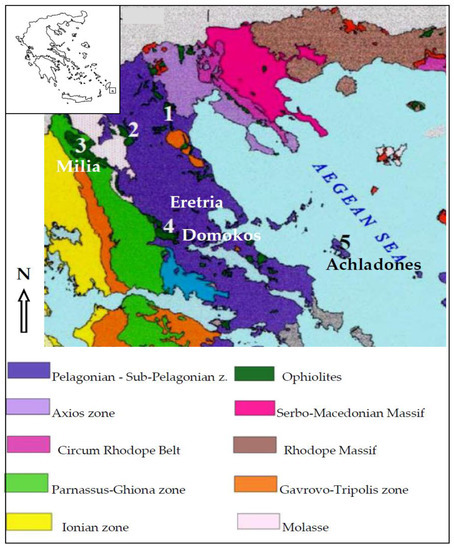 - Economou, M.; Dimou, E.; Economou, G.; Migiros, G.; Vacondios, I.; Grivas, E.; Rassios, A.; Dabitzias, S. Chromite Deposits of Greece: Athens; Theophrastus Publications: Athens, Greece, 1986; pp. 129–159. [Google Scholar]
