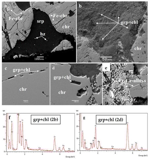 Back-scattered electron images (Au-coating of polished sections) of strongly fragmented chromitite from the Skyros ophiolite. Porous Fe-chromite is common at the peripheral parts of chromite grains (a). Graphite-like carbon, co-existing with silicates (chlorite), occurs as an inclusion in chromite, filling cracks within chromite, and as rounded, nodule-like aggregates. The inclusions are better revealed on unpolished parts of polished sections showing nodule-like graphite aggregates (b–d). Metal alloys occur within cracks cross-cutting chromite grains (e). X-ray spectra of graphite–silicate assemblages showed the presence of C, Si, Mg, Al, and O (f,g) in variable proportions. Symbols: grp = graphite; chr = chromite; Fe-chr = iron chromite; chl = chlorite; srp = serpentine; hz = heazlewoodite.