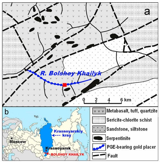 (a) Regional geology of the placer area at Bolshoy Khailyk (Figure 1a: simplified after [4]) and (b) a general map showing the location of the area in the Russian Federation (shown by red square symbol).