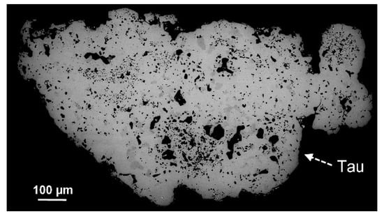 Back-scattered electron image showing the placer grain of platiniferous tetra-auricupride (Tau) from Bolshoy Khailyk. Black inclusions are filled with magnetite; gray phases are Rh–Co-bearing pentlandite and members of the tulameenite–ferronickelplatinum series.