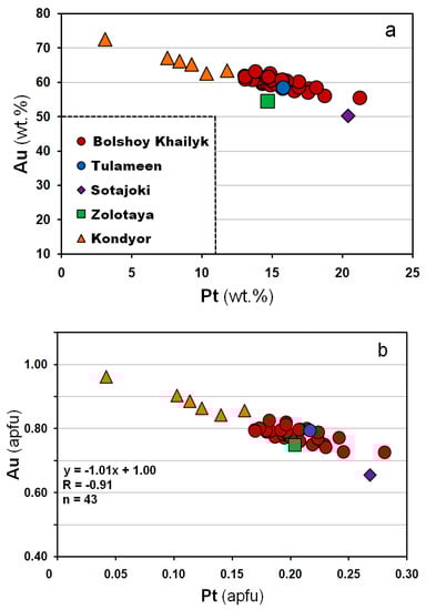 Plots of Pt vs. Au expressed in weight % (a) and values of atoms per formula unit (apfu), on the basis of a total of 2 apfu (b), showing compositional variations in grains of tetra-auricupride from Bolshoy Khailyk (this study) and various localities reported in the literature.
