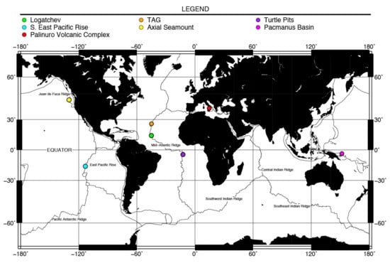 Location and details of the 7 hydrothermal fields and their respective geological settings studied are presented in Figure 1 and Table 1. Three of the sample sites are located along the Mid-Atlantic Ridge (Trans-Atlantic Geotraverse (TAG), Logatchev and Turtle Pits). TAG is one of the most extensively studied and is unique in that it is a mature deposit showing distinct zonation due to extensive hydrothermal reworking and recrystallization [81]. Turtle Pits varies from other MAR hydrothermal fields because of the extraordinary high vent fluid exit temperatures (±407 °C) that were recorded here [82] whereas Logatchev is distinct due to its ultramafic host rock composition [83].