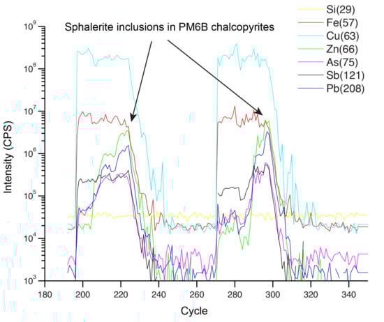 As highlighted by Wohlgemuth-Ueberwasser et al. (2015) [77], trace element contents in sulfide minerals are controlled by a range of variables including mineral type, mineral texture, zonation and the presence of micro-inclusions within the mineral. For each individual spot, LA-ICP-MS spectra were investigated for any strong shifts in signal intensity of certain major elements (Si, Fe, Cu, Zn, As, Sb and Pb) (Figure 3). Such strong shifts in intensity within the LA-ICP-MS spectra were assumed to be mineral inclusions and removed where possible by deleting the corresponding signal cycles; if not possible the data point was removed from the dataset entirely. Precision of trace element analysis is inherently difficult to assess when minerals are often heterogeneous and trace elements are not consistently above detection limits. However, based on external references, trace element concentrations have a precision <10% (Table 2).