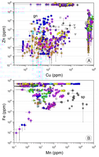 Cu, Zn and Fe are the major base metals observed in all SMS deposits, and consequently form their own minerals, however, all are observed in abundance (up to wt %) in other minerals (Figure 4A,B). Contrastingly, Mn is not present as its own sulfide mineral in SMS deposits and its highest concentrations are observed in sphalerite (Figure 4B, stars).