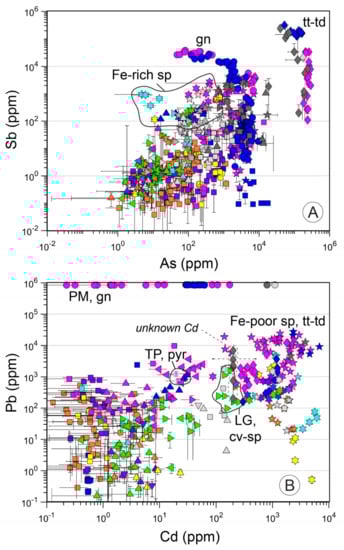 The highest As and Sb concentrations are found in deposits forming within arc-related settings, where they often form as sulfosalts (tennantite-tetrahedrite solid solution series, Figure 5A, diamonds). Where present at high concentrations, Pb forms galena or Pb-sulfosalts, observed here only in samples from arc-related settings (Pacmanus and Palinuro). Notwithstanding the presence of galena, high Pb concentrations are also observed in Fe-poor sphalerite from all settings and sulfosalts (Figure 5B). Cadmium is almost exclusively associated with sphalerite from all geological settings (Figure 5B, stars), but is also observed in tennantite-tetrahedrite from Pacmanus and Palinuro.