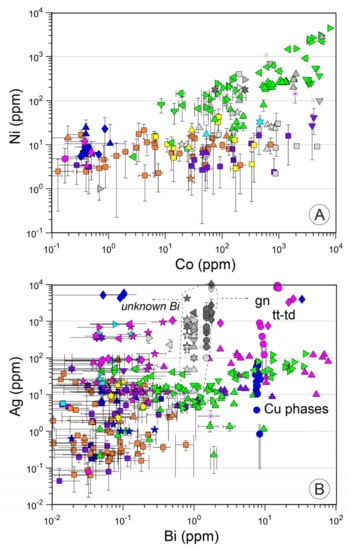 Figure 4, Figure 5 and Figure 6 present the LA-ICP-MS dataset for Cu, Zn, Fe, Mn, As, Sb, Pb, Cd, Co, Ni, Bi and Ag separated by mineral type and geological setting (mature, immature, ultramafic, hot spot, back arc, volcanic arc) combined with data from the published literature (grey symbols, Table S8) to provide a larger number of samples and for comparison with the data from this study. In the case of Cd for tennantite-tetrahedrite and Bi for tennantite-tetrahedrite, galena, Cu-phases and sphalerite, an estimate is taken in order to present published Ag and Pb data.
