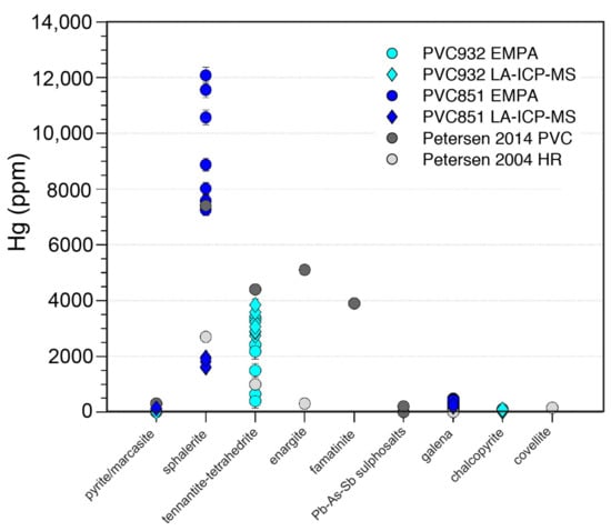 Figure 7. Hg (ppm) concentrations in pyrite, tennantite-tetrahedrite, sphalerite and galena from Palinuro based on EMPA and LA-ICP-MS analysis. Shown for comparison are Hg concentrations in a range of sulfide and sulfosalts minerals from Palinuro and Hook Ridge analysed by Petersen et al. (2014) [84] and Petersen et al. (2004) [109].