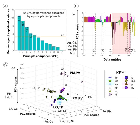 Four principle components that explain more than one variable’s worth of information (8.3%, red line Figure 8A) have been identified and explain 64.2% of the variance in the dataset. Identification of the principle components was based on the coefficients calculated for each element. Principle component factor one (PC1) accounts for 21.3% of the variance has been identified as the concentration of magmatophile trace elements (Ag, Cd, Zn, Sb, As, Pb and Bi, Figure 8B), indicating that geological setting, e.g., MOR versus arc-related is a large control on trace elements. Whilst not possible to run PCA including Hg data, it can be expected that Hg would be associated with these magmatophile elements. This is consistent with other observations of elevated Hg at Palinuro as well as Hook Ridge [84,109]. However, superimposed on PC1 is mineralogy, with galena, sulfosalts and sphalerite displaying the highest magmatophile elements versus Fe-rich minerals of pyrite, pyrrhotite, marcasite and chalcopyrite.