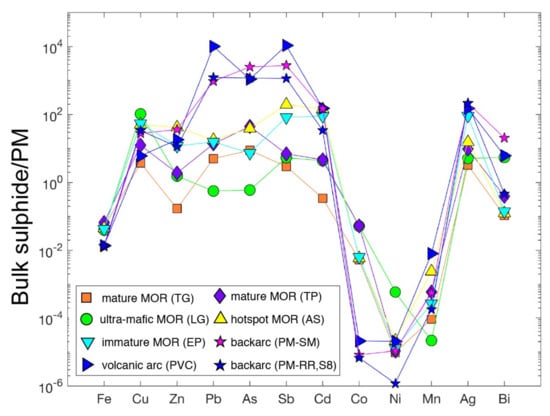 Other samples include those from the ASHES (Axial Seamount Hydrothermal Emissions Studies) vent field located within the hotspot associated caldera of Axial Volcano on the Juan de Fuca Ridge and those from a young vent field at 16°43’S at the ultra-fast spreading ridge of the East Pacific Rise. In contrast, the Pacmanus and Palinuro hydrothermal fields are part of wide range of deposits associated with subduction zones. Pacmanus is felsic-hosted (dacite to rhyolite) rather than the more usual mafic-hosted setting typical of mid-ocean ridges. Palinuro (Tyrrhenian Sea) is different to other hydrothermal fields studied here, as it is located within an active volcanic arc. Sulfides at Palinuro are buried beneath a thin layer of sediment, and are suggested to have formed largely by sub-seafloor replacement and infiltration [84]. As a result, chimney structures that are typical for most SMS are not observed. Both Pacmanus (Satanic Mills area) and Palinuro are distinct from other hydrothermal fields because magmatic volatiles (CO2, SO2) from a degassing magma chamber at depth may contribute to the enrichment in magmatophile and trace elements including As, Sb, Bi and Te [84,85,86]. In addition to those metals, samples from Palinuro also display anomalously high concentrations of Hg [84].