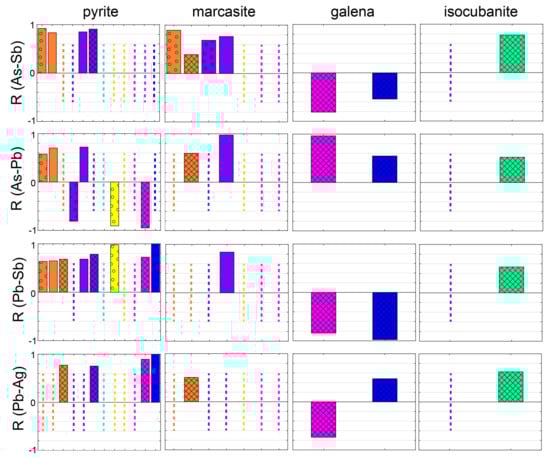 Combined with observations of trace element distribution in different sulfide minerals, the correlation coefficients between trace elements in selected mineral types were calculated (Table 5 and Figure 10). If trace elements are observed to be associated with one another in a particular sulfide, this information can be used to inform which minerals, textures and deposits have higher potential toxicity and which require stricter monitoring in terms of mining activity in the future. Based on sample size, P-values were calculated for each R-value present in the dataset. The P-value is the probability that the current result would be found if the correlation coefficient were zero (null hypothesis). If the P value (probability) is greater than 0.05 (at 95% confidence internal), the correlation coefficient is considered statistically insignificant and the associated R-value is no longer considered (presented as a dashed line on Figure 10).