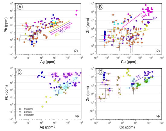 Mean EMPA concentration data of major elements (S, Fe, Cu, Zn and Pb) and standard deviation (SD) for each mineral per individual thin section/mount (ppm) is presented in Table S5 in Supplementary Materials. The LA-ICP-MS data set (625 spot analyses) is reported in Supplementary materials (Table S6) and includes Ag, As, Bi, Cd, Co, Mn, Ni, Pb, Sb, Cu, Zn and Fe; as well as Hg for Palinuro sulfide minerals. For a few samples, trace element analyses rely on EMPA data due to lack of calibration standard, small grain size or intergrowths unsuitable for the laser ablation method. This includes As, Co, Cu and Zn for pyrrhotite from Turtle Pits (TP4B sample), As, Sb, Zn, Cu and Mn for colloform pyrite and chalcopyrite from Pacmanus (PM5E and PM6B) and Hg data for minerals from Palinuro (177 data points, mean concentrations and SD reported in Table S7). Only a few LA-ICP-MS analyses were gathered for these samples (3 for TP4B pyrrhotite and 4 for Pacmanus colloform pyrite).