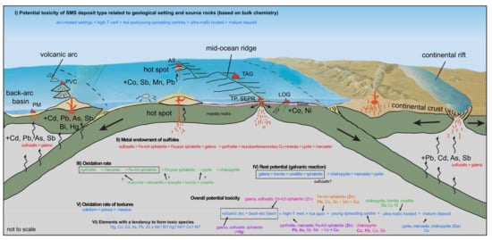 Several publications over the past years have demonstrated the controls of the geological setting on the bulk chemistry of seafloor massive sulfides [63,66,67,110,111]. With our samples, we have selected sites from various geotectonic settings in order to encompass the full range of minerals and chemistry focusing on elements considered likely to form toxic species including Cu, Zn, Pb, As, Sb, Cd, Co, Ni, Mn, Ag and Bi. Excluding major elements Fe, Cu and Zn, it is clear from our results (shown in Figure 8 and Figure 9) that the tectonic setting (including host rock composition and/or source of magmatic volatiles) is one of the major controls (PC1) of the distribution of potentially toxic elements (Ag, Sb, As, Pb, Bi), confirming the general tectonic implications discussed in the published literature and reiterated in the Introduction.