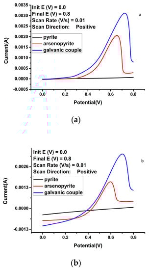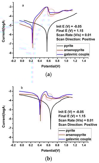 As shown in Figure 4, the corrosion potential of the galvanic pair is similar to that of arsenopyrite (0.22, 0.40, 0.46) but very different from that of pyrite (0.56, 0.63, 0.64 in three investigated solutions respectively), which indicates that the corrosion of the galvanic pair occurs at a potential similar to that of arsenopyrite. The slight decrease in the current marked in Figure 4 by a red circle is due to the oxidation of iron in the arsenopyrite, which is characteristic of arsenopyrite oxidation (pyrite does not have this characteristic) [26,28]. This is the same as the characteristic of the galvanic effect (an anodic reaction occurs first without changing the reaction process). It is also consistent with the results of the linear voltammetry analysis.