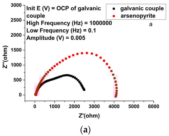 The rate determining step and the reaction mechanism of the electrode system can be illustrated by electrochemical impedance spectroscopy (EIS). Nyquist plots of the galvanic pair and arsenopyrite in the three investigated solutions are shown in Figure 5. The shape of the Nyquist plot of the galvanic pair is very similar to that of arsenopyrite in the three investigated solutions with the same initial E. This shows that the reaction mechanisms of the galvanic pair and arsenopyrite alone are similar under the same potential.